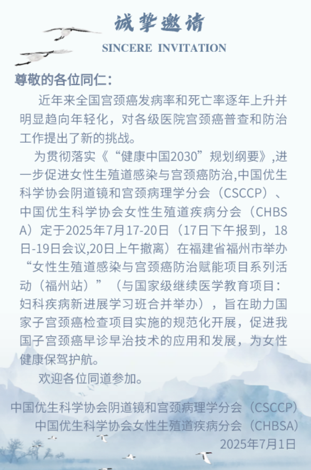 2025 年 7 月 17 日至 20 日,由中國優(yōu)生科學協(xié)會陰道鏡和宮頸病理學分會(CSCCP)、中國優(yōu)生科學協(xié)會女性生殖道疾病分會(CHBSA)主辦的 “女性生殖道感染與宮頸癌防治賦能項目系列活動(福州站)” 將在福建省福州市召開。該活動與國家級繼續(xù)醫(yī)學教育項目 “婦科疾病新進展學習班” 合并舉辦,旨在助力國家子宮頸癌檢查項目規(guī)范化實施,促進宮頸癌早診早治技術應用與發(fā)展,為女性健康保駕護航。經(jīng)確認,中藥制劑派特靈受邀出席,將參與女性下生殖道人乳頭瘤病毒(HPV)感染及相關疾病專家共識解讀環(huán)節(jié)。