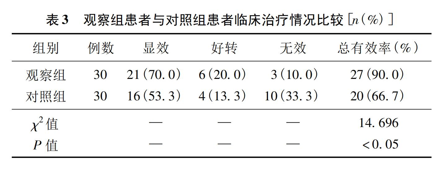 觀察組治療后有27例患者顯示有效,占90.0%,顯著高于對(duì)照組的66.7%,差異具有統(tǒng)計(jì)學(xué)意義(P<0.05)。
