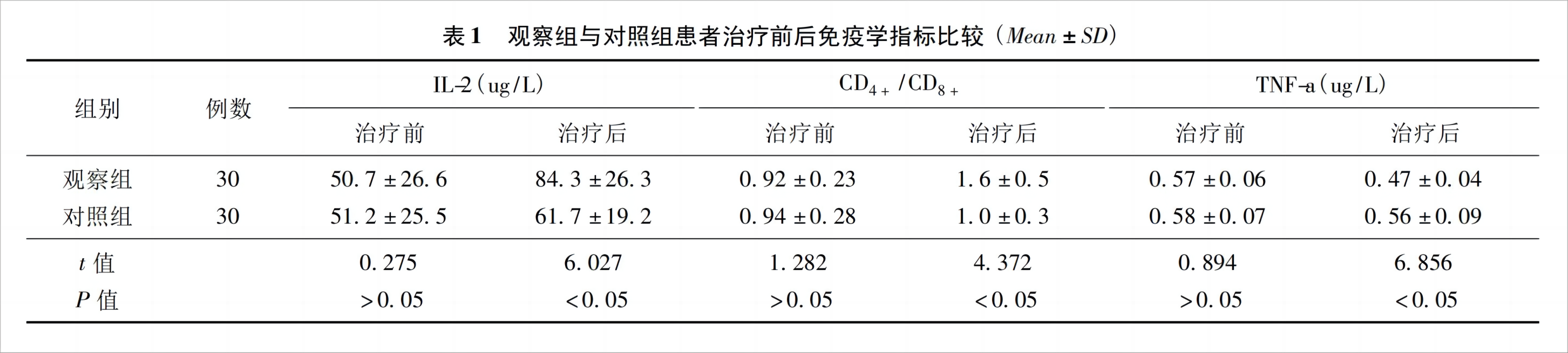 治療前兩組患者IL-2、CD4+/CD8+、TNF-a差異無統(tǒng)計(jì)學(xué)意義(P>0.05);