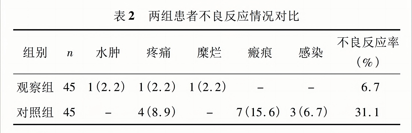 對照組患者不良反應(yīng)多表現(xiàn)為局部疼痛?瘢痕等,部分患者出現(xiàn)感染情況,其中局部疼痛4例,瘢痕7例,感染3例,不良反應(yīng)率為31.1%,兩組患者不良反應(yīng)情況對比差異顯著(P<0.05),見表2?